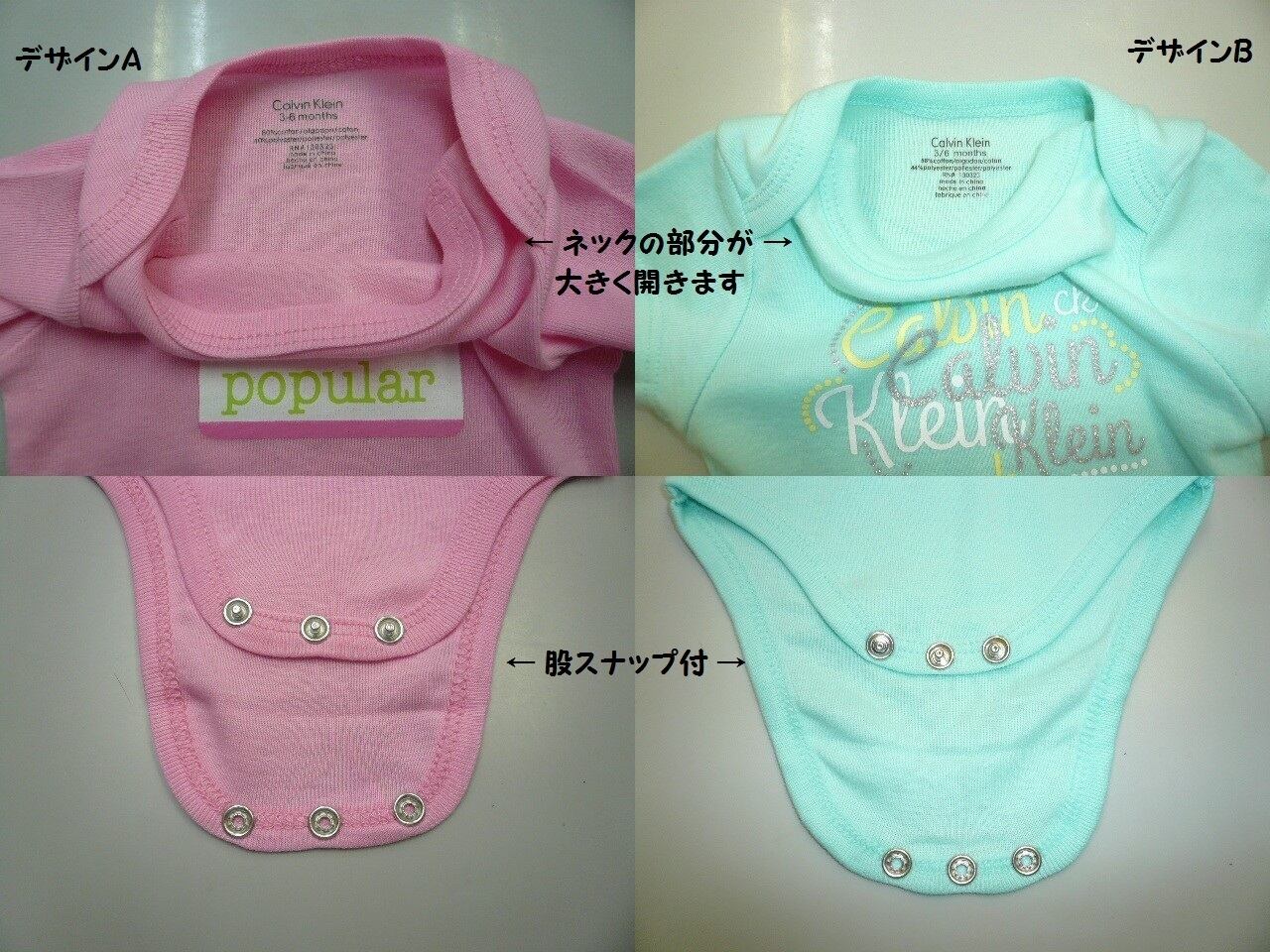 ネック部分が大きく開き、股スナップが付いておりますので、お着替え、おむつ交換も簡単にできますよ。